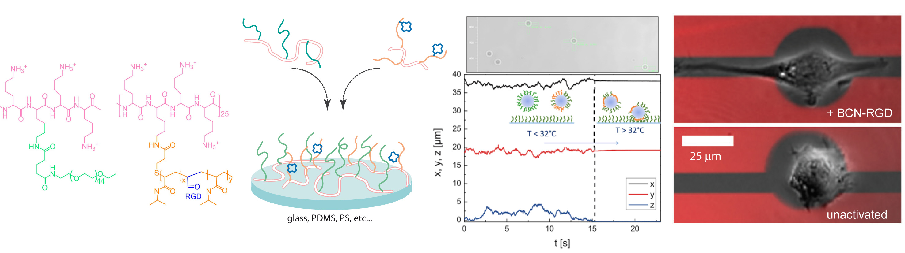Tracking of colloid soft adhesion and control of cell binding & migration onto mixed layers of stimuli-responsive comb-like PLL derivatives.